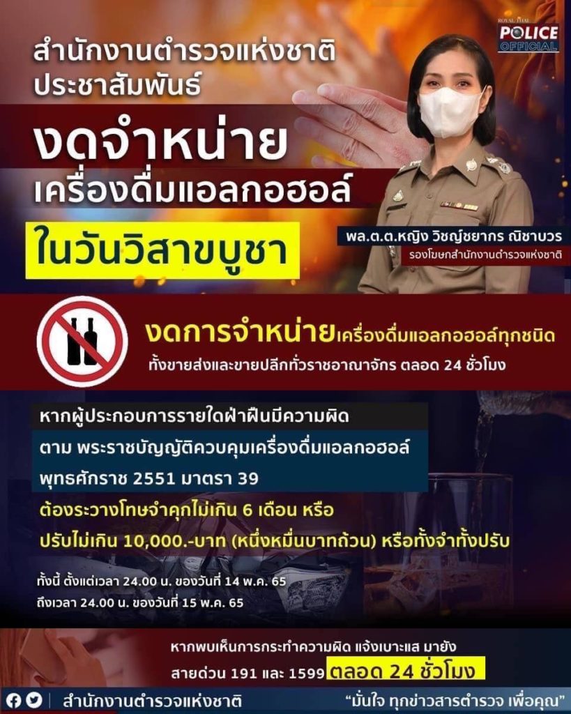 วันที่ 15 พ.ค.2565 เป็นวันวิสาขะบูชา ประชาสัมพันธ์ งดจำหน่ายเครื่องดื่มแอลกอฮอล์ ในวันวิสาขบูชา ตลอด 24 ชั่วโมง