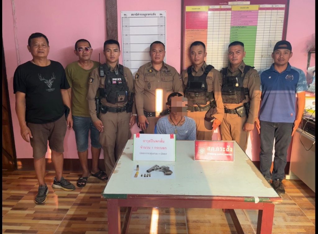 เมื่อวันที่ 29 เมษายน 2568 ภายใต้การอำนวยการของ พ.ต.อ.ธีรพล ยมนา ผกก.สภ.กระสัง โดยมี พ.ต.ท.บุญชอบ ใจกล้า รอง ผกก.ป.ฯ, พ.ต.ท.สุชิน วัดจะโป๊ะ รอง ผกก.สส.ฯ, พ.ต.ท.ชินวัส โคนาโล สว.สส.ฯ, ร.ต.อ.สมนึก นะลาหนองแวง รอง สว.สส.ฯ พร้อมด้วยเจ้าหน้าที่ชุดสืบสวนและสายตรวจ ร่วมกันจับกุมนายอนุ…..อายุ 36 ปี ชาวบ้าน ต.สูงเนิน อ.กระสัง จ.บุรีรัมย์ของกลางที่ตรวจยึดได้ประกอบด้วย อาวุธปืนพกสั้น 1 กระบอก พร้อมปลอกกระสุนและหัวกระสุนหลากหลายขนาด รวมถึงปลอกปลายรังเพลิง นอกจากนี้ยังพบว่า นายอนุวัฒน์มีพฤติกรรมเสพยาเสพติดให้โทษประเภท 1 (เมทแอมเฟตามีน)เจ้าหน้าที่ได้แจ้งข้อหา “มีอาวุธปืนและเครื่องกระสุนปืนไว้ในครอบครองโดยไม่ได้รับอนุญาต” และ “เสพยาเสพติดให้โทษประเภท 1 โดยฝ่าฝืนต่อกฎหมาย” พร้อมนำตัวผู้ต้องหาพร้อมของกลางส่งพนักงานสอบสวนเพื่อดำเนินคดีตามกฎหมายต่อไป