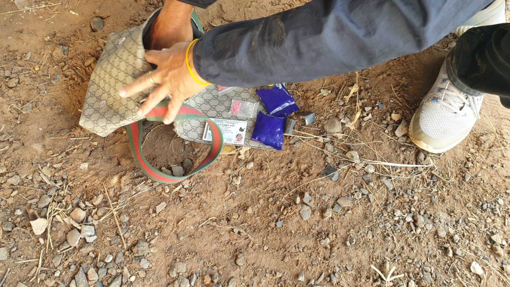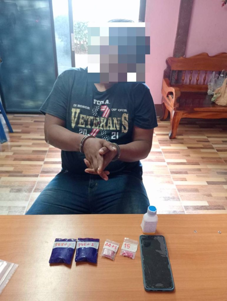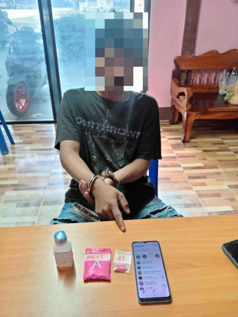 พบของกลางยาบ้า 447 เม็ด โทรศัพท์มือถือ 1 เครื่อง และกระเป๋าสะพาย 1 ใบ ถูกแจ้งข้อหา “จำหน่ายและมีไว้ในครอบครองเพื่อจำหน่ายยาเสพติดให้โทษประเภท 1 (เมทแอมเฟตามีน) และเสพยาเสพติดให้โทษประเภท 1 โดยไม่ได้รับอนุญาต”