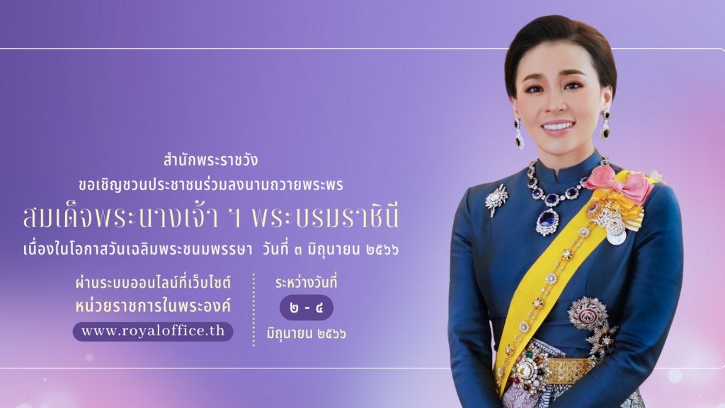 สำนักพระราชวัง ขอเชิญชวนประชาชนร่วมลงนามถวายพระพร สมเด็จพระนางเจ้า ฯ พระบรมราชินี เนื่องในโอกาสวันเฉลิมพระชนมพรรษา วันที่ ๓ มิถุนายน ๒๕๖๖ ผ่านระบบออนไลน์ ที่เว็บไซต์หน่วยราชการในพระองค์ www.royaloffice.th ระหว่างวันที่ ๒-๔ มิถุนายน ๒๕๖๖