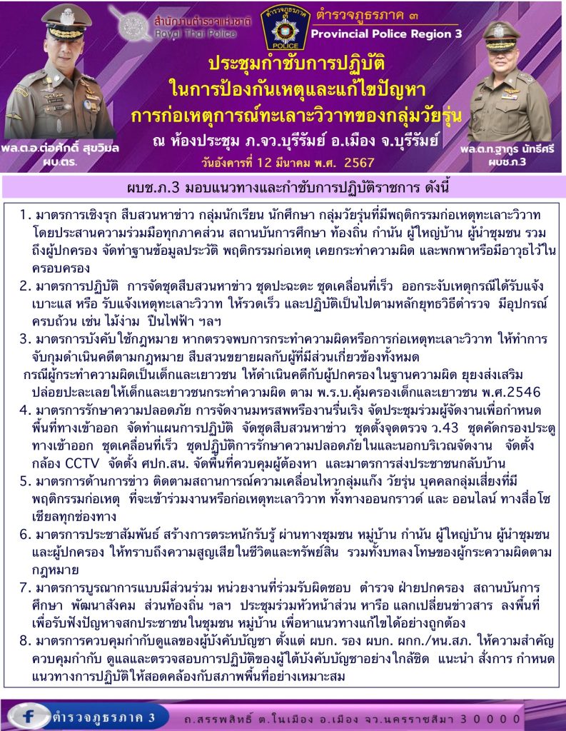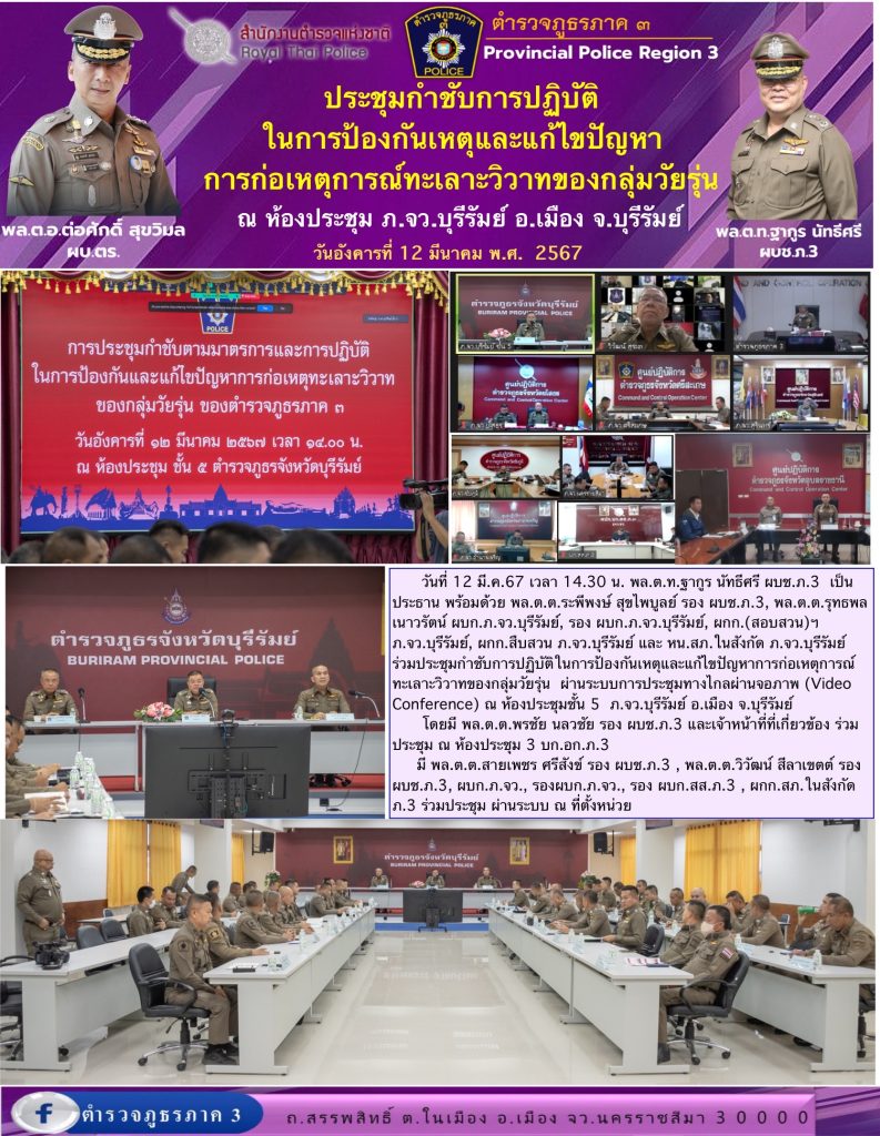 ทะเลาะวิวาทของกลุ่มวัยรุ่น ผ่านระบบการประชุมทางไกลผ่านจอภาพ (Video Conference) ณ ห้องประชุมชั้น 5 ภ.จว.บุรีรัมย์ อ.เมือง จ.บุรีรัมย์ โดยมี พล.ต.ต.พรชัย นลวชัย รอง ผบช.ภ.3 และเจ้าหน้าที่ที่เกี่ยวข้อง ร่วม ประชุม ณ ห้องประชุม 3 บก.อก.ภ.3