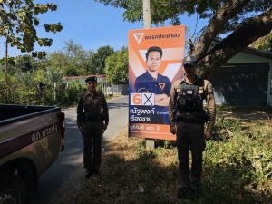 สภ.กระสัง ตรวจสอบป้ายหาเสียงเลือกตั้งในพื้นที่ ป้องกันการกระทำผิดกฎหมายเลือกตั้ง