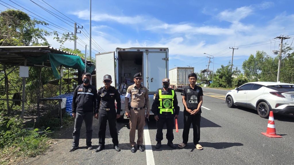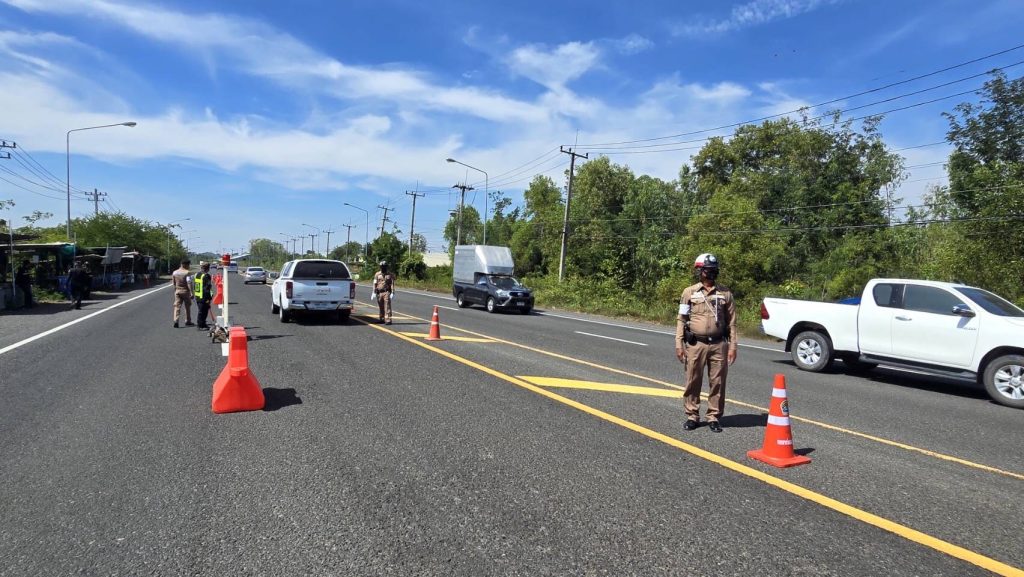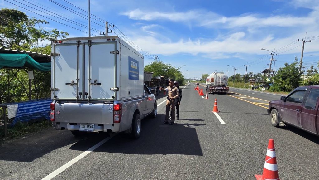 พ.ต.ท.วรกฤต มั่งมูล สวป.สภ.กระสัง พร้อมร้อยเวร 6-0 สายตรวจจราจร บูรณาการร่วมกับเจ้าหน้าที่ด่านกักกันสัตว์บุรีรัมย์ ตั้งจุดตรวจ–จุดสกัดบนถนนหมายเลข 226 (หัวทะเล–วารินชำราบ) บริเวณสะพานลำชี ต.หนองเต็ง อ.กระสัง